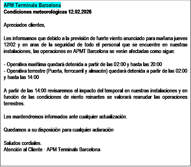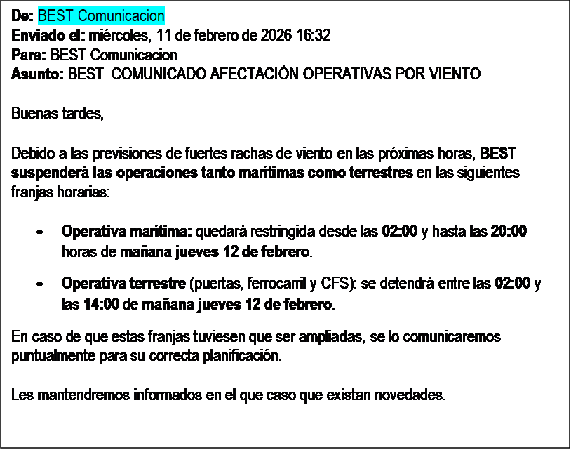 Se adjuntan comunicados recibidos de APM Terminals y BEST con motivo de la afectación en sus operativas por la previsión de temporal de viento.