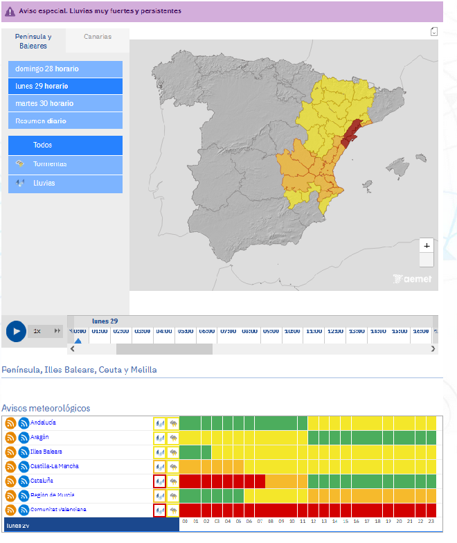 La Dirección General de Tráfico, informa que, ante los avisos de la AEMET sobre precipitaciones intensas con riesgo extremo (nivel rojo) en la zona de Levante, según el mapa adjunto, se recomienda evitar la zona y mantenerse informado sobre el estado de las carreteras.